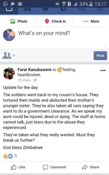 “What would you do if you & your family survived a 2am-15 minute ZDF attack on your house with 7 children one of them 12 years old, by 25 SAS snipers with semi automatic weapons; randomly firing tracer bullets & stun grenades? Is this the New Justice? New Dawn? New Era? New Zim?” he wrote.