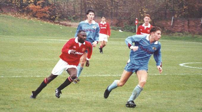 The images show the Zimbabwe international playing in a match which also features Nicky Butt, one of the members of the Class of ’92, which had the likes of David Beckham, Ryan Giggs, Paul Scholes and the Neville brothers — Gary and Phil.