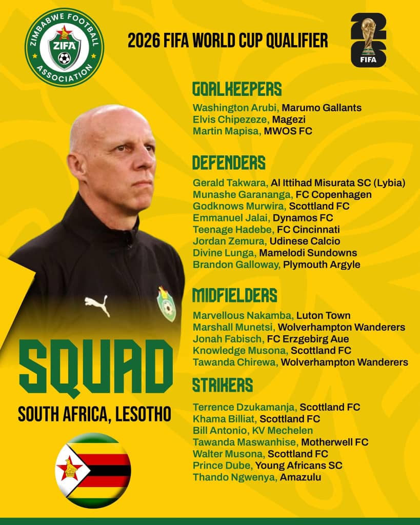 Zimbabwe face South Africa on 10 October at the Moses Mabhida Stadium in Durban before taking on Lesotho a few days later.